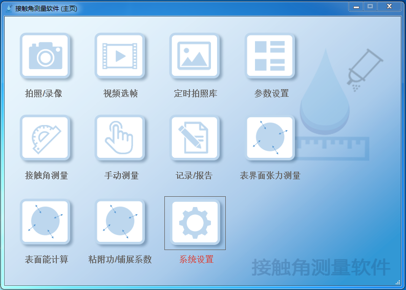 影像分析法是通过滴出一滴满足要求体积的液体于固体表面,通过影像分析技术,测量或计算出液体与固体表面的接触角值的简易方法.作为影像分析法的仪器,其基本组成部分不外乎光源、样品台、镜头、图像采集系统、进样系统.简单的一个影像分析法可以不含图像采购系统,而通过镜头里的十字形校正线去直接相切于镜头里观察到的接触角得到。
